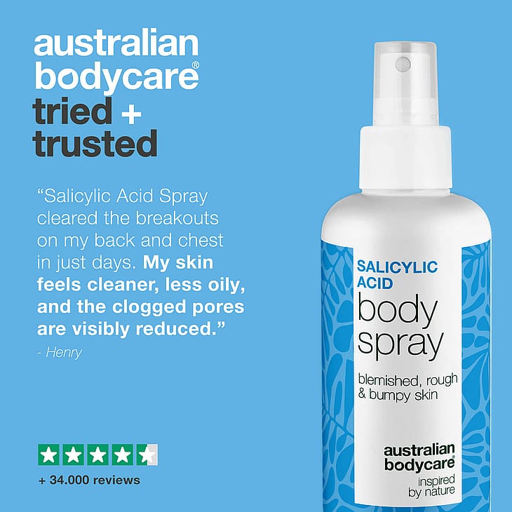2 % salisyylihappoa ja glykolihappoa sisältävä vartalosuihkeemme on erityisesti suunniteltu torjumaan aknea ja epäpuhtauksia keholla. Luonnosta inspiroitunut se on valmistettu tehokkaista ainesosista, jotka puhdistavat syvältä, rauhoittavat ja estävät uusien epäpuhtauksien syntymistä – kuivattamatta tai ärsyttämättä ihoa.