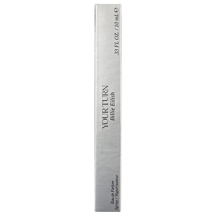 Your Turn -tuoksun pullo on saanut inspiraationsa Billien kiinnostuksesta sisustukseen ja itseilmaisuun. Design esittää kahta päällekkäistä noppaa, joissa on kohokuvioidut pisteet. Pullon tyylipuhtaat ja minimalistiset linjat sekä hopeakromiviimeistely tekevät siitä nykyaikaisen taideteoksen, joka antaa sekä leikkisän että jännittävän vaikutelman ja heijastaa tuoksun rohkean vangitsevaa luonnetta.
