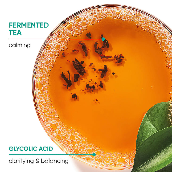 Se sisältää fermentoitua teetä ja glykolihappoa, ja ravitsee tasapainoisesti sekä hiuksia että hiuspohjaa.