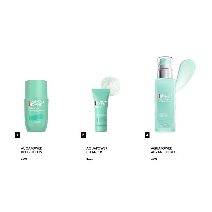 Biotherm Aquapower Men Holiday Set-ihonhoitopakkaus sisältää: Aquapower Advanced Gel 75 ml + Aquapower Oligo-Thermal Gel Cleanser 40 ml + Aquapower Ice Cooling Effect Antiperspirant 75 ml.
