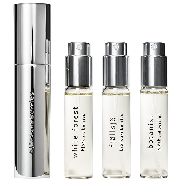 Eau de Parfum Travel Set sisältää kolme suosituinta Björk and Berries -tuoksua ja tyylikkään ja kestävän, ruostumattomasta teräksestä valmistetun kotelon. Kotelo on suunniteltu sopimaan täydellisesti laukkuun tai kosmetiikkalaukkuun, ja sen ansiosta voit ottaa suosikkituoksusi kätevästi mukaan mihin vain.