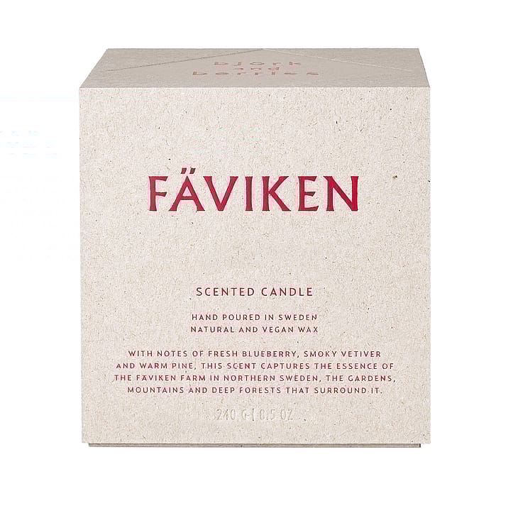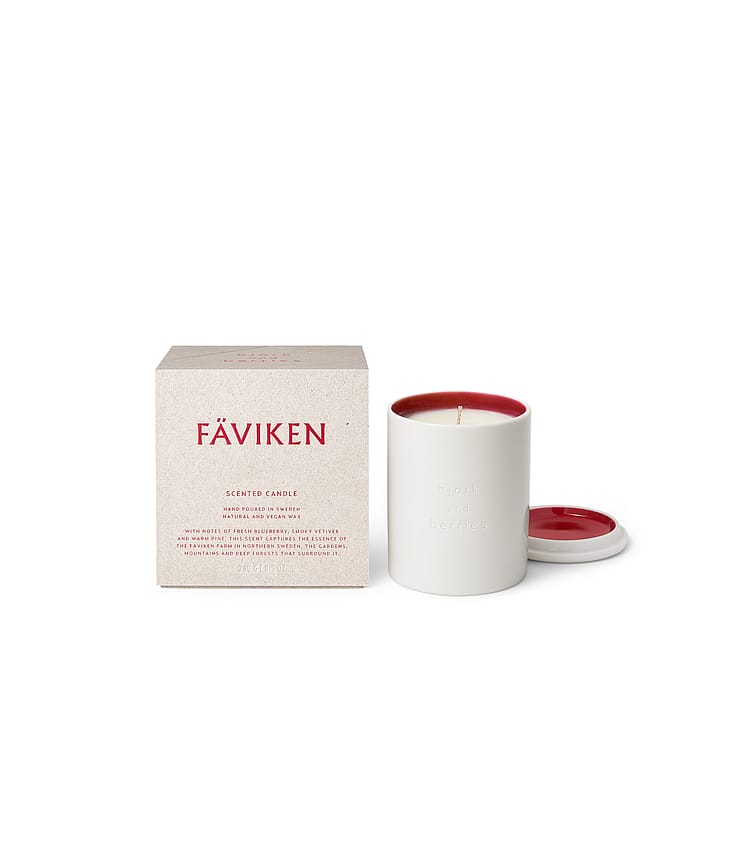 Tämän tuoksukynttilän raikkaan mustikan, savuisen vetiverin ja lämpimän männyn vivahteet tuovat mieleen Pohjois-Ruotsissa sijaitsevan Fävikenin tilan puutarhat ja sitä ympäröivät metsät.