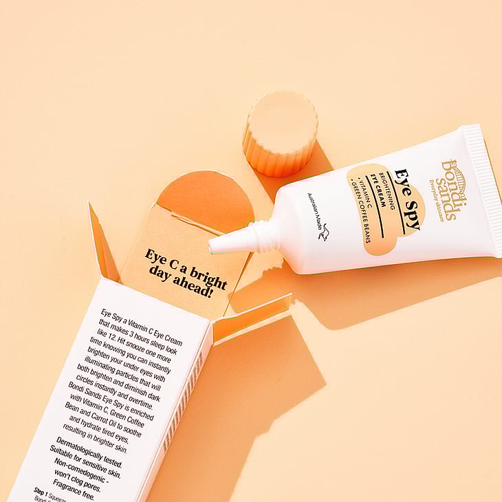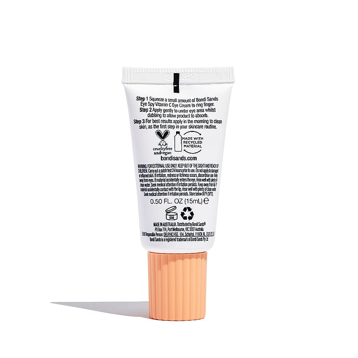 Haluaisitko näyttää siltä, kuin olisit kolmen tunnin sijaan nukkunut kaksitoista tuntia? Eye Spy Vitamin C Eye Cream on C-vitamiinia sisältävä silmänympärysvoide, jonka kirkastavat hiukkaset tekevät silmänympärysalueesta välittömästi kirkkaamman ja häivyttävät tummia silmänaluksia ajan kuluessa. Koostumus sisältää myös vihreitä kahvipapuja ja porkkanaöljyä, jotka rauhoittavat ja kosteuttavat väsynyttä silmänympärysihoa tehden katseesta virkeämmän näköisen. Sopii kaikille ihotyypeille, myös herkälle iholle. Vegaaninen.
