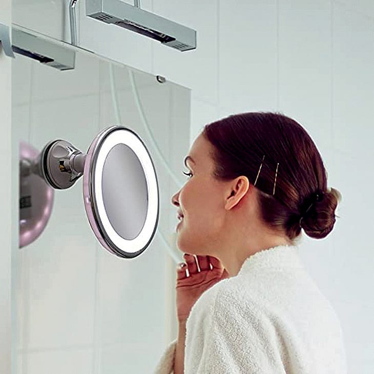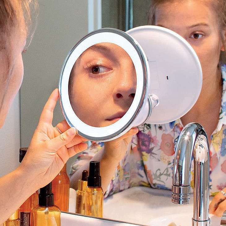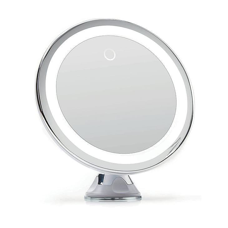 Tyylikäs meikkipeili 10x kertaisella suurennuksella ja sisäänrakennetulla himmennettävällä LED-valolla.