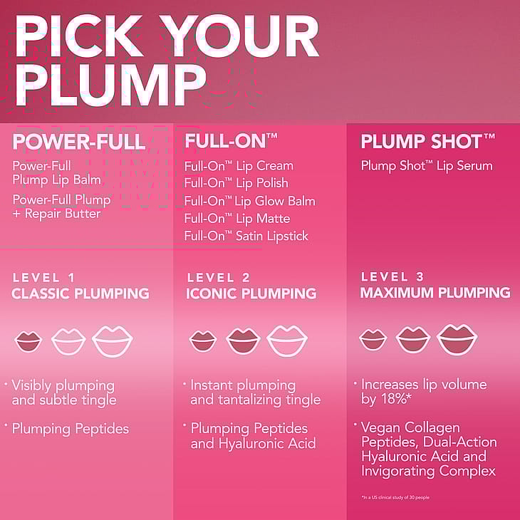 • Levitä kerros Power-Full Plump Lip Balmin päälle, niin saat täyteläiset, hemmotellut ja kiiltävät huulet, tai lisää Power Line Plumping Lip Liner -rajausväriä saadaksesi näyttävän huulimeikin.
