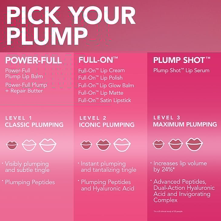 Levitä yksin huulille huulihoitona tai kevyempänä huulikiiltona toisen huulituotteen päälle tai sekoita sinun Buxom-suosikkien Lip Gloss tai Lip Cream –tuotteiden kanssa, saadaksesi näyttävämmän ja täyteläisemmän näköiset huulet. Pro-tip: Levitä ohut kerro Plump Shot™ huulille ennen nukkumaanmenoa.