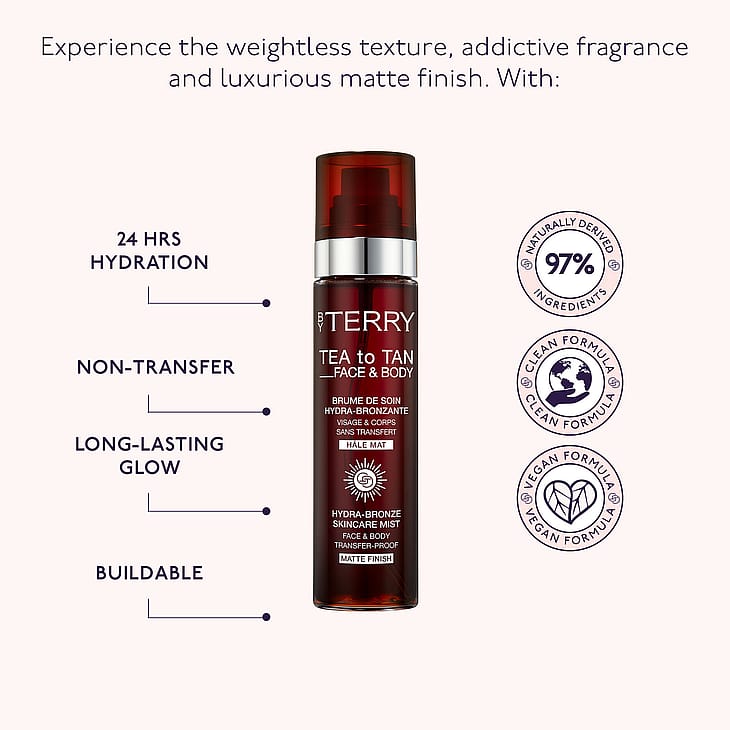 10 vuotta tuotteen luomisen jälkeen BY TERRY uudistaa ikonisen Tea to Tan Face & Body -suihkeensa. Tämä kosteuttava ihonhoitosuihke on uudistettu täysin uudella koostumuksella ja uudella pakkauksella. Se on ainutlaatuinen sekoitus ihonhoitoa ja täydellistä itseruskettavaa luomaan suojaavan kosteutuksen ja luonnollisen aurinkoisen hehkun. Sen vesipohjainen koostumus antaa iholle pitkäkestoisen sävyn luomatta peittävää pintaa.