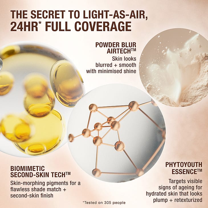 Charlotten palkittu Airbrush Flawless Foundation on nyt UUDISTUNUT SEURAAVAA SUKUPOLVEA varten! Tämä koko päivän pysyvä, erittäin kevyt ja täysin peittävä koostumus tarjoaa jopa 24 TUNNIKSI* toiselta iholta tuntuvan 3D-mattapinnan, mikä mahdollistaa ennennäkemättömän silottavan, ihohuokosia häivyttävän airbrush-vaikutuksen! Tehoja tarjoaa Charlotten 7-in-1 AIRBRUSH SKIN MIRACLE, joka sisältää Biomimetic Second-Skin Tech™-, Powder Blur AirTech™- ja Phytoyouth Essence™ Time Machine Extract -ratkaisut ja jolla saat sileämmältä, kiinteämmältä ja nuorekkaammalta näyttävän ihon jokaisella käyttökerralla!