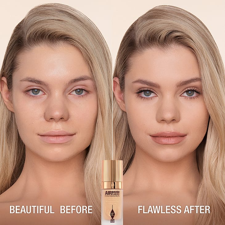 Charlotten palkittu Airbrush Flawless Foundation on nyt UUDISTUNUT SEURAAVAA SUKUPOLVEA varten! Tämä koko päivän pysyvä, erittäin kevyt ja täysin peittävä koostumus tarjoaa jopa 24 TUNNIKSI* toiselta iholta tuntuvan 3D-mattapinnan, mikä mahdollistaa ennennäkemättömän silottavan, ihohuokosia häivyttävän airbrush-vaikutuksen! Tehoja tarjoaa Charlotten 7-in-1 AIRBRUSH SKIN MIRACLE, joka sisältää Biomimetic Second-Skin Tech™-, Powder Blur AirTech™- ja Phytoyouth Essence™ Time Machine Extract -ratkaisut ja jolla saat sileämmältä, kiinteämmältä ja nuorekkaammalta näyttävän ihon jokaisella käyttökerralla!