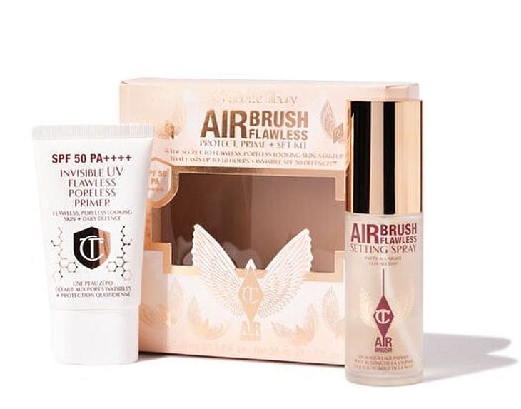 - Airbrush Flawless Setting Spray: Charlotten kevyt, kliinisesti testattu vedenkestävä kiinnityssuihke, joka pohjustaa ja kiinnittää meikin jopa 16 tunniksi*. Palkittu sosiaalisen median sensaatio, jonka virheettömän kalvon muodostajat luovat näkymättömän meikkiä koko päivän suojaavan kerroksen valumista, häipymistä tai rasvaamista vastaan. Sisältää japanilaista vihreää teetä pehmeää ja kosteutettua ihoa varten, ja aloe veraa sileän ja kimmoisan tuntuman saamiseksi sekä PoreAway™-teknologialla, joka pitää huokoset puhtaan näköisinä.