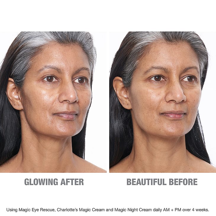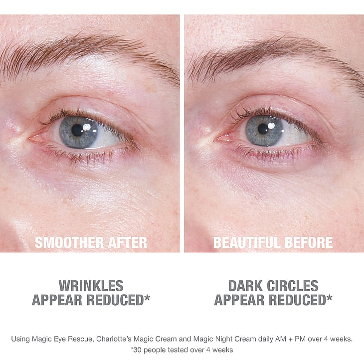 CHARLOTTEN MAGIC EYE RESCUE INSTANTLY GETS TO WORK – sileyttää ja kirkastaa silmänalusten alueen näköä täyteläisellä voiteella, joka LEVIÄÄ OHUIDEN JUONTEIDEN JA RYPPYJEN YLI ja KIRKASTAA tummien silmänalusten ILMETTÄ samalla kun se vähentää turvotusta viilentävällä ja rauhoittavalla vaikutuksella ja antaa SILMÄLLE VÄLITÖNTÄ PIRISTYSTÄ.