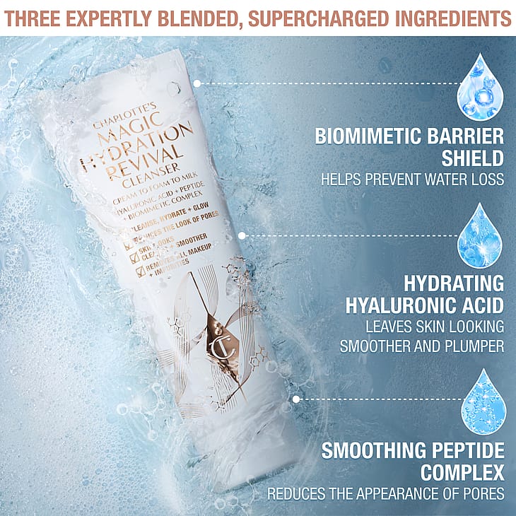Charlotte’s Magic Hydration Revival Cleanser. Tämä 3-in-1 pohjustava puhdistusaine sisältää tehokkaita ainesosia, kuten hyaluronihappoa ja peptidejä, jokta tuovat esiin kylpylänraikkaan ihon hehkun. Kerma-vaahto-maitomainen koostumus puhdistaa, kosteuttaa, virkistää ja valmistelee ihon yhdellä helpolla vaiheella. Se tuottaa välittömän ihon uudistumisen kliinisesti todistetuilla tuloksilla.