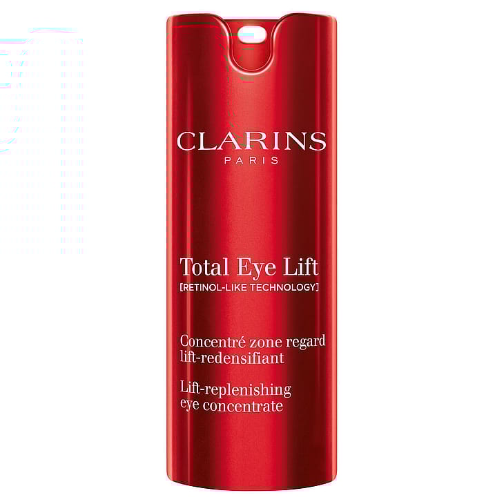 Koe silmänympärysalueen kohotus – vain 30 sekunnissa*. Clarins Total Eye Lift on innovatiivinen silmänympärysvoide, joka yhdistää kasvipohjaisen teknologian ja näkyvästi kiinteyttävän vaikutuksen. Koostumus sisältää ekologista harunganauutetta, joka on yhtä tehokas kuin retinol – mutta hellävarainen silmänympärysten herkälle iholle** – ja edistää kollageenintuotantoa x12.**** Yhdessä bioteknologisen jania-uutteen kanssa se kiinteyttää ihoa ajan myötä, ja täyteläinen voidekoostumus muodostaa iholle napakoittavan kalvon, joka antaa välittömästi kohottavan tunteen.* Nyt uudelleentäytettävässä pakkauksessa, joka tekee rutiinistasi vastuullisemman.*****