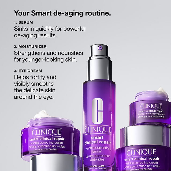 Smart Clinical Repair Serum on tehokas seerumi, joka on suunniteltu niille, jotka etsivät tehokasta ratkaisua ryppyjä vastaan. Tämä seerumi yhdistää kolme anti-aging-teknologiaa, jotka taistelevat tehokkaasti erilaisia ryppyjä ja hienoja juonteita vastaan monesta suunnasta ja voivat tuottaa näkyviä tuloksia jo 10 päivässä. Se on rikastettu CL 1870 Laser Focus Complexilla, joka sisältää erityisesti valittuja peptidejä, jotka stimuloivat ihon luonnollista kollageenituotantoa, vahvistaen ja uudelleenrakentaen ihon rakennetta. Hyaluronihappo tarjoaa välittömän kosteuden, mikä antaa täyteläisemmän ihon ja vähentää näkyvästi ryppyjen ja hienojen juonteiden ilmettä. Lisäksi tehokas retinoidi edistää ihon solujen uusiutumista, mikä edelleen vähentää ryppyjen esiintymistä ja antaa iholle hehkuvan sävyn.