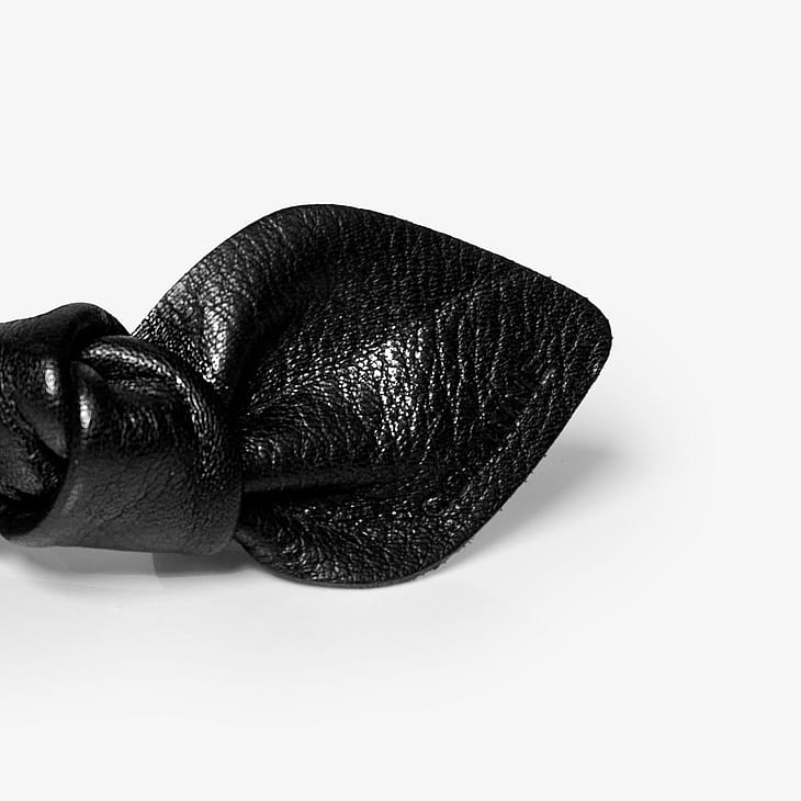 Tämä on pieni rusettimme niille, jotka haluavat lisätä jotain huomaamattomampaa kuin vakiokokomme. Se on käsintehty ensiluokkaisesta italialaisesta nahasta ja kiinnitetään metalliklipsellä. Juhlalookin luomiseksi voit yhdistellä eri kokoja samassa kampauksessa.