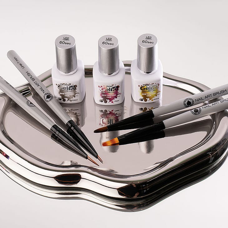 Metallic Ink antaa metallisen viimeistelyn, ja voit käyttää sitä joko koko kynnellä tai lisätä sillä luovia designeja. Saat parhaan tuloksen ravistamalla pulloa huolellisesti ja levittämällä lakkaa kuivalle pinnalle. Käytä lakkaa sellaisenaan, yhdistä useita erisävyisiä kerroksia tai luo ainutlaatuisia tehosteita ja designeja kynnen eri osiin. Muista antaa lakan kuivua kokonaan ennen kuin levität Gel iQ Top Coat -päällyslakkaa.