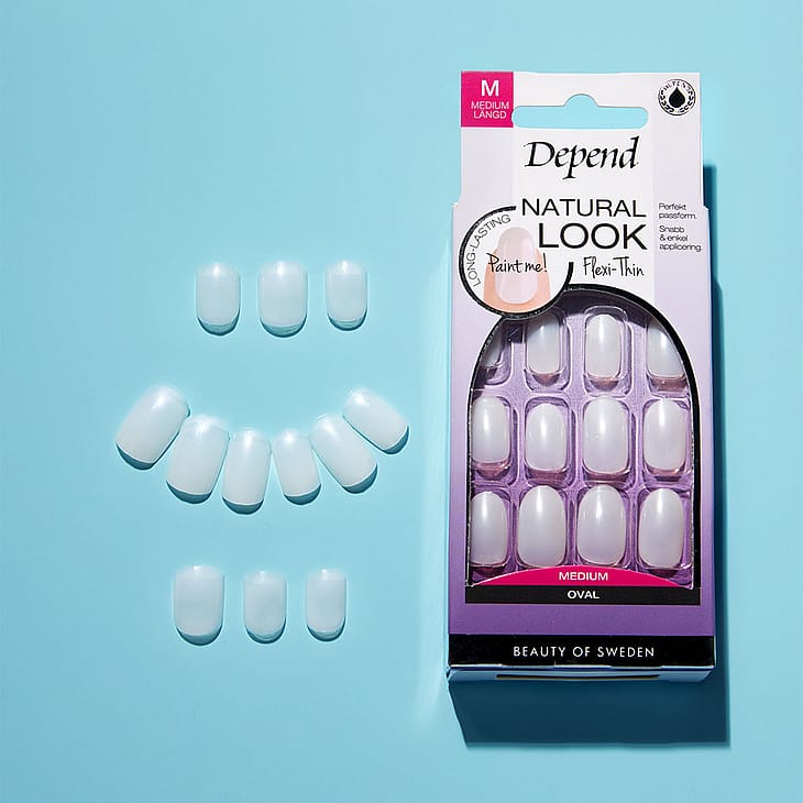Värjäämättömät tekokynnet, jotka voit lakata oman tyylisi mukaisiksi. Täydellisesti istuvat Flexi-Thin-kynnet on helppo kiinnittää mukana tulevalla liimalla.