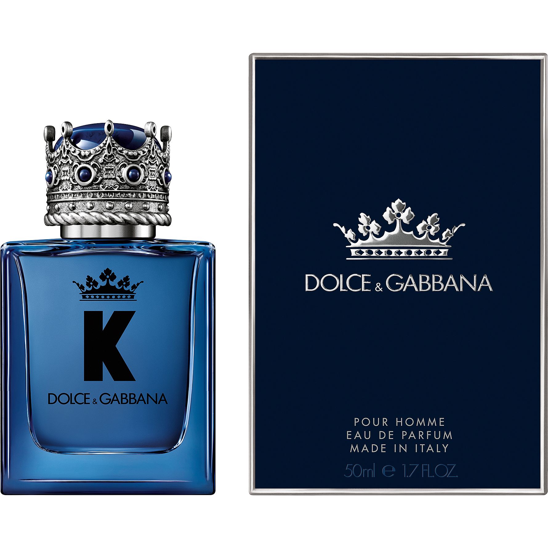 K från Dolce&Gabbana Eau de Parfum -tuoksun pullolla on sama geometrinen muotoilu kuin alkuperäiselläkin tuoksulla, mutta sävy on intensiivinen kuninkaallinen sininen. Kruunumainen korkki on päällystetty kiiltävällä hopeapatinalla, joka tuo esiin hienostunutta ja kupolinmuotoista sinistä lapis lazuli -kiveä.