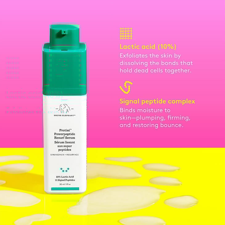 Protini™ Powerpeptide Resurf Serum on kaikkina vuorokaudenaikoina käytettävä seerumi, joka palauttaa ihon rakennetta, sävyä, hehkua ja kimmoisuutta 10 % maitohapon, ihoa vahvistavien signaalipeptidien, kasviperäisten kasvutekijöiden ja tukevien aminohappojen avulla. Tehokkaasti tiivistetty 11 peptidin yhdistelmä tekee ihosta täyteläisemmän ja kimmoisamman samalla kun se kohdistuu sameaan ja epätasaiseen ihonsävyyn. Hienojen juonteiden, auringon aiheuttamien vaurioiden ja laajentuneiden ihohuokosten ulkonäkö paranee ja ihon luonnollinen hehku palautuu, samalla kun tehokkaat kosteuttavat ainesosat lisäävät kosteutta. Antioksidanttipitoiset, hajusteettomat kasviöljyt ja vitamiinit (tokotrienolit, skvalaani, vihreän teen siemenöljy ja marulaöljy) rauhoittavat ihoa ja antavat kevyen kosteutuksen.