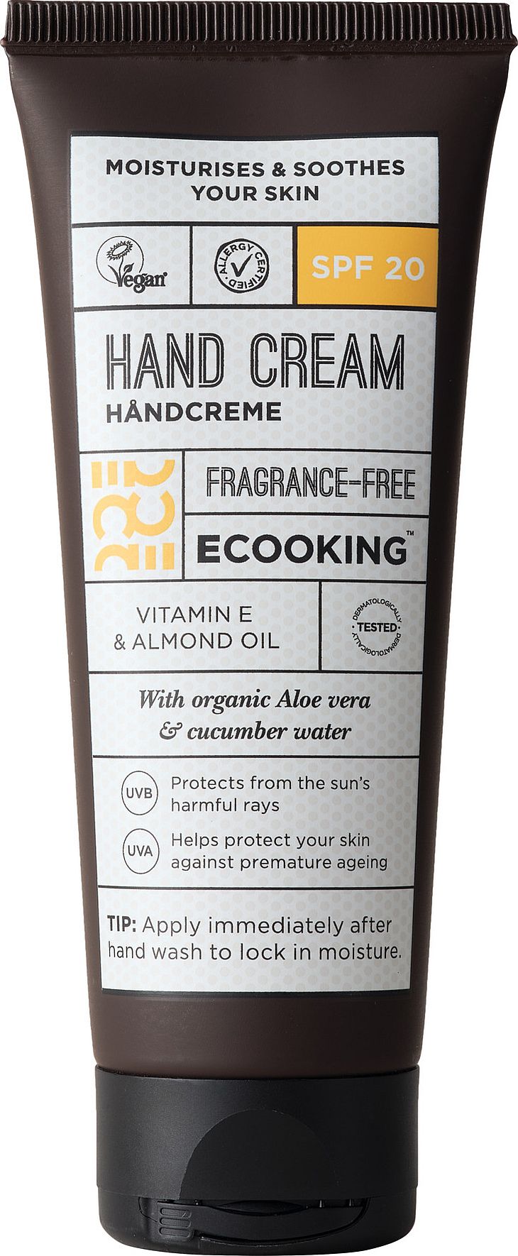 Hand Cream SPF 20 on kosteuttava ja ravinteikas koostumus, jossa on kaksi kemiallista aurinkosuodatinta, jotka suojaavat käsiä auringon haitallisilta UVA- ja UVB-säteiltä.