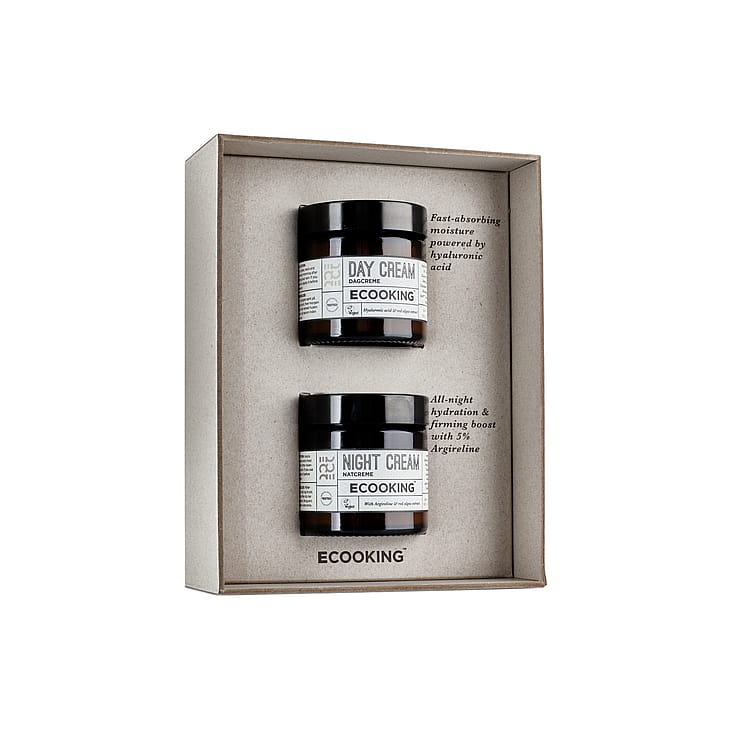 Dagcreme: Aqua**, Aloe Barbadensis Leaf Water*, Prunus Armeniaca Kernel Oil*, Triheptanoin**, Cetearyl Alcohol**, Cucumis Sativus Fruit Water*, Glycerin*, Glyceryl Stearate**, Propanediol**, Butyrospermum Parkii Butter*, Stearic Acid**, Caprylyl Glycol**, Tocopherol**, Carbomer, Sodium Lauroyl Glutamate**, Glyceryl Caprylate**, Sodium Hyaluronate**, Sodium Levulinate**, Helianthus Annuus Seed Oil**, Potassium Sorbate, Sodium Hydroxide, Citric Acid**, Cucurbita Pepo Seed Extract**, Sodium Benzoate, Jania Rubens Extract**, Parfum, Geraniol, Limonene, Linalool. * = organic · ** = natural Natcreme: Aqua**, Aloe Barbadensis Leaf Extract*, Prunus Armeniaca Kernel Oil*, Cetearyl Alcohol**, Glycerin*, Glyceryl Stearate**, Butyrospermum Parkii Butter*, Propanediol**, Stearic Acid**, Caprylyl Glycol**, Carbomer, Tocopherol**, Sodium Lauroyl Glutamate**, Glyceryl Caprylate**, Sodium Levulinate**, Helianthus Annuus Seed Oil*, Sodium Hydroxide, Potassium Sorbate, Cucurbita Pepo Seed Extract**, Jania Rubens Extract**, Citric Acid**, Acetyl Hexapeptide-8, Parfum, Linalool, Geraniol, Limonene, Eugenol, Citronellol, Citral, Benzyl Benzoate, Farnesol. * = organic ** = natural