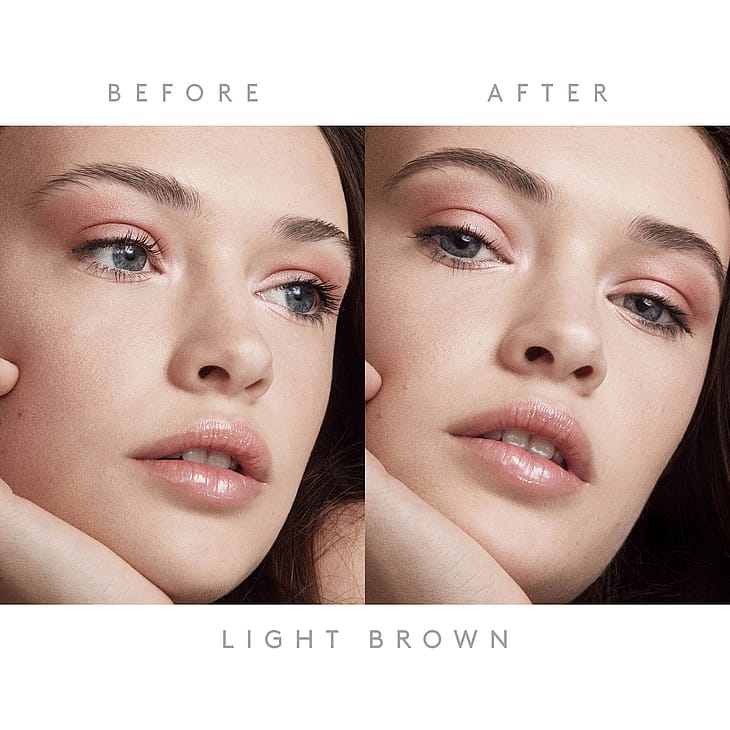 Valitse hiustenväriä lähinnä oleva sävy luonnolliseen lopputulokseen. Piirrä karvamaisia vetoja rajataksesi ja täyttääksesi kulmat. Viimeistele harjaamalla kulmat kynään sisäänrakennetulla siveltimellä.