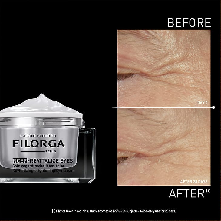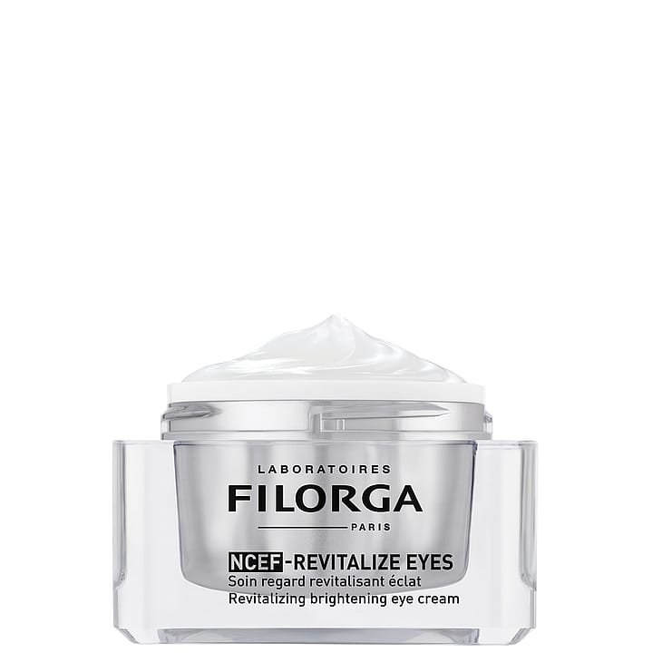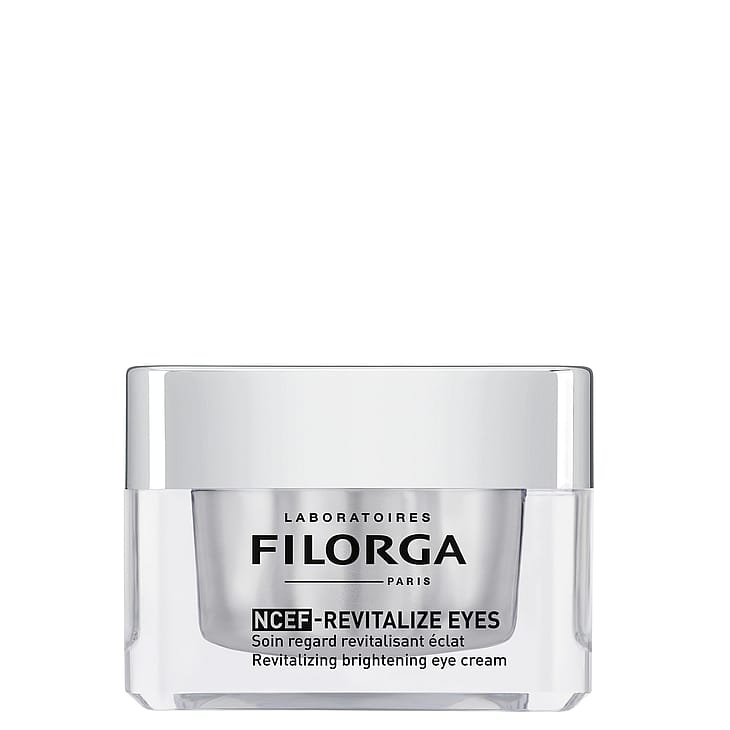 Koe sileämpi, kiinteämpi ja heleämpi silmänympärysiho FILORGA NCEF-Revitalize Eyes -silmänympärysvoiteella. Esteettisten, elinvoimaisuutta antavien pistoshoitojen inspiroima edistyksellinen tuote vaikuttaa kaikkiin näkyviin ikääntymisen merkkeihin rypyistä turvotukseen, tummiin silmänaluksiin ja kiinteyden menetykseen. Koostumus sisältää suuren pitoisuuden NCEF-ainesosaa sekä kasvipohjaisen uuteduon silkkialbitsia ja aasiannystytähteä auttaen kiinteyttämään silmäluomia ja vahvistamaan ihon rakennetta. 4 % peptidiyhdistelmä silottaa juonteita ja hyaluronihappo kosteuttaa intensiivisesti ja pitkäkestoisesti. Niasiiniamidi (2 %) auttaa kirkastamaan pigmenttiläiskiä näkyvästi ja tasoittaa silmänympärysihon sävyä. Raikas geelivoidekoostumus imeytyy nopeasti ja sopii myös herkälle iholle. Kliinisesti todistettu tehokkuus. Testattu silmälääkärin valvonnassa.