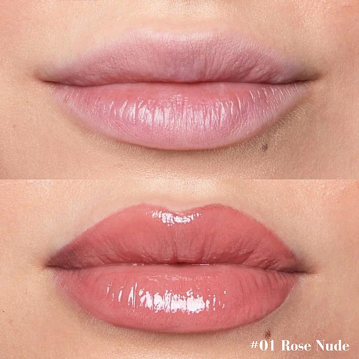 #1 Rose Nude: Polyisobutene, Tridecyl trimellitate, Isononyl isononanoate, Ethylhexyl palmitate, Cellobiose octanonanoate, Silica dimethyl silylate, Tocopherol acetate, Titanium Dioxide, CI 77492 , CI 15850, CI 45410, CI 77499, Menthyl lactate, Vanillyl butyl ether, BHT, Propylparaben, Flavor