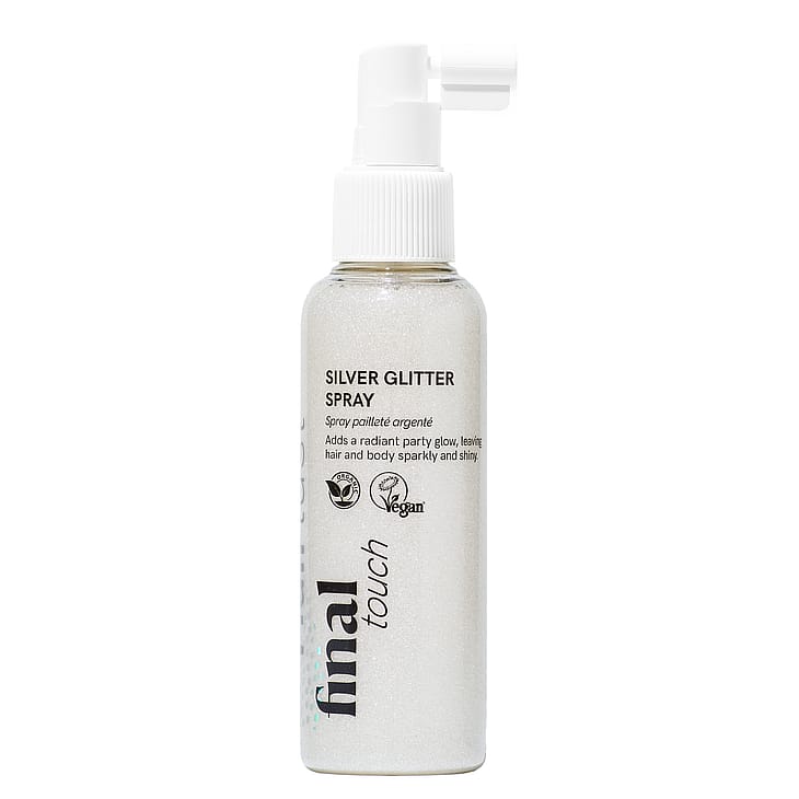 Final Touch™ Silver Glitter Spray saa sinut säihkymään! Tämä kevyt suihke sisältää erittäin hienoa hopeaglitteriä, joka antaa säihkyvän hehkun ja saa sinut loistamaan. Ekologisilla goji-, selja- ja mangouutteilla rikastettu glittersuihke ravitsee ja suojaa ihoa sekä hiuksia jättämättä niitä tahmeiksi.