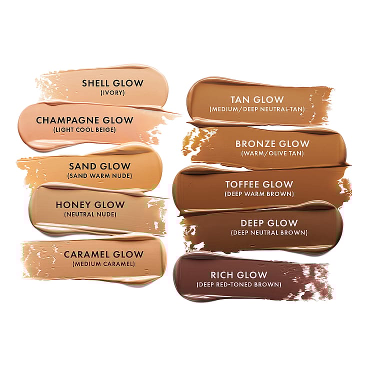 INGREDIENTS (Shades: Tan Glow, Bronze Glow, Toffee Glow, Deep Glow & Rich Glow): AQUA (WATER), HYDROGENATED DIDECENE, GLYCERIN, PROPANEDIOL, MICA, ISOAMYL LAURATE, CETYL PEG/PPG-10/1 DIMETHICONE, SQUALANE, BUTYLOCTYL SALICYLATE, SOYBEAN GLYCERIDES, HYDROGENATED STYRENE/ISOPRENE COPOLYMER, POLYGLYCERYL-4 ISOSTEARATE, SODIUM CHLORIDE, BUTYROSPERMUM PARKII BUTTER UNSAPONIFIABLES (BUTYROSPERMUM PARKII (SHEA) BUTTER UNSAPONIFIABLES), HYDROXYACETOPHENONE, DISTEARDIMONIUM HECTORITE, 1, 2-HEXANEDIOL, CAPRYLYL GLYCOL, BUTYLENE GLYCOL, TRISODIUM ETHYLENEDIAMINE DISUCCINATE, LENS ESCULENTA FRUIT EXTRACT (LENS ESCULENTA (LENTIL) FRUIT EXTRACT), ASCORBYL PALMITATE, PHENOXYETHANOL, PENTAERYTHRITYL TETRA-DI-T-BUTYL HYDROXYHYDROCINNAMATE, ETHYLHEXYLGLYCERIN, CAPRYLIC/CAPRIC TRIGLYCERIDE, CETYL PALMITATE, SORBITAN STEARATE, POLYSORBATE 80, CITRIC ACID, TRIPEPTIDE-3, HYDROGENATED LECITHIN, PALMITOYL TETRAPEPTIDE-10. MAY CONTAIN (+/-): CI 77492 (IRON OXIDES), CI 77163 (BISMUTH OXYCHLORIDE), CI 77491 (IRON OXIDES), CI 77499 (IRON OXIDES), CI 77891 (TITANIUM DIOXIDE).