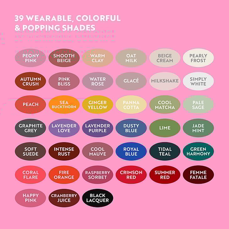 värikkäissä sävyissä. Valitse sävy, joka parhaiten vastaa mielialaasi ja täydentää ilmettäsi. Valikoima tarjoaa kaikkea aina raikkaista, tyylikkäistä neutraaleista sävyistä ilahduttavan pehmeisiin pastellisävyihin sekä loistavan kirkkaisiin ja täyteläisen intensiivisiin tummiin sävyihin. Erittäin leveä erikoissivellin on innovatiivisesti suunniteltu luomaan täydellisen tasainen lakkapinta ilman raitoja. Korkealaatuinen koostumus on nopeasti kuivuva, halkeilematon ja tehty säilyttämään värinsä koko käytön ajan.