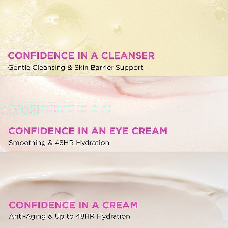 Limited-edition kolmiosainen anti-aging- ja kosteuttava ihonhoitosetti, jossa on täysikokoiset Confidence in a Cream-, Confidence in a Cleanser- ja Confidence in an Eye Cream -voiteet.