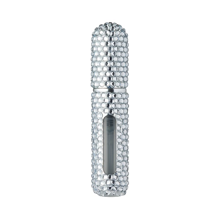 Pieni suihkepullo, jossa on hopeanvärisiä koristekiviä ja joka voidaan täyttää hajuvedellä tai partavedellä. Sopii täydellisesti otettavaksi mukaan matkalle tai kuntosalille tai pidettäväksi mukana käsilaukussa, salkussa tai töissä. Pulloon mahtuu 5 ml hajuvettä (noin 65 suihkeannosta). Pullon sivussa olevan pienen ikkunan läpi näet, milloin pullo tarvitsee täyttöä.