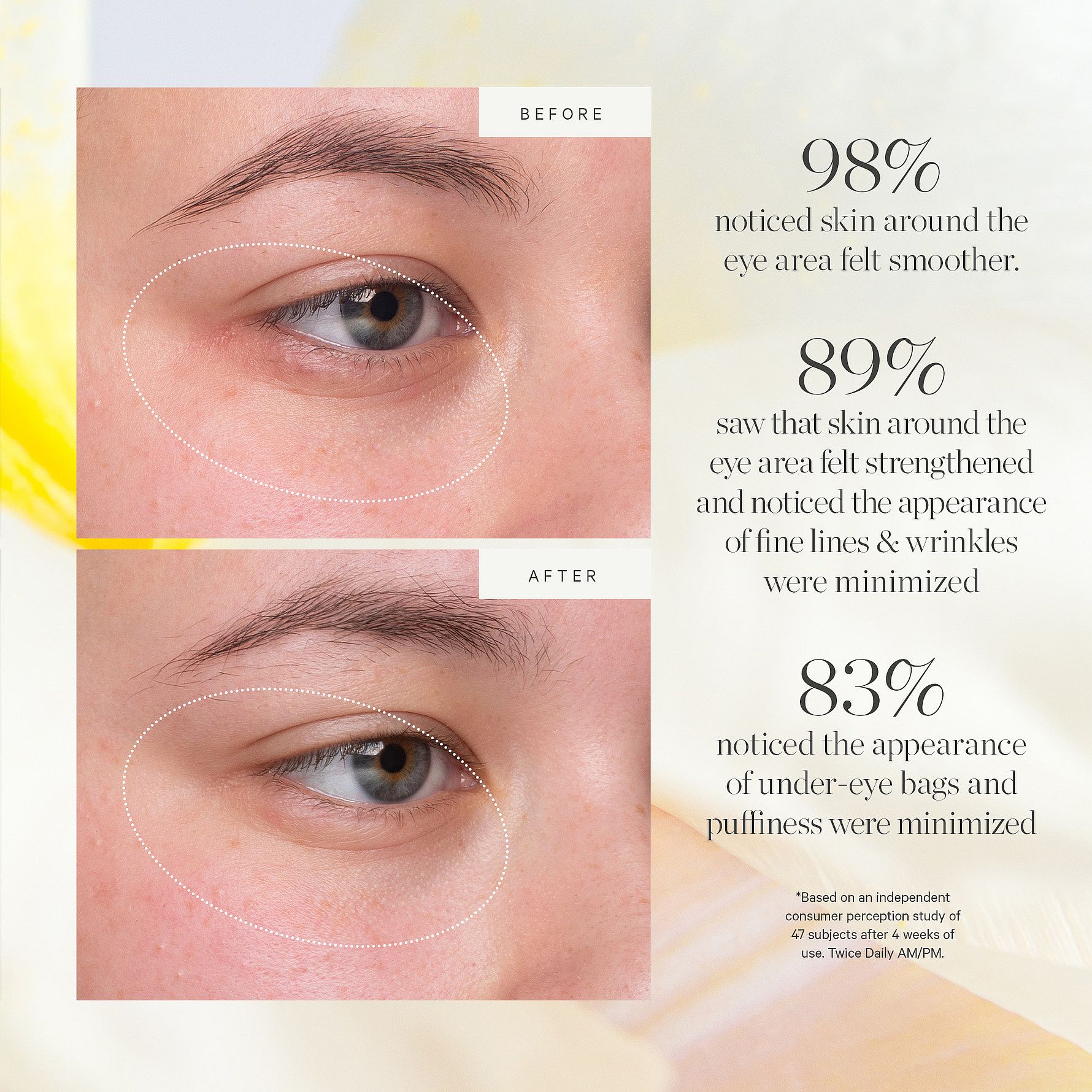 Tämä samettinen silmänympärysvoide käyttää 5,5-prosenttista aktiivista C-vitamiinisekoitusta superhedelmistä Kakadu Plum + Cloudberry sekä hellävaraista mutta tehokasta askorbyyliglukosidia kirkastamaan silmänympärysihoa, kun taas vitamiinipitoiset kasviperäiset aineet ja peptidit hoitavat juonteita, ryppyjä ja kiinteyttä säteilevämmän ja nuorekkaamman näköisen ihon saavuttamiseksi.