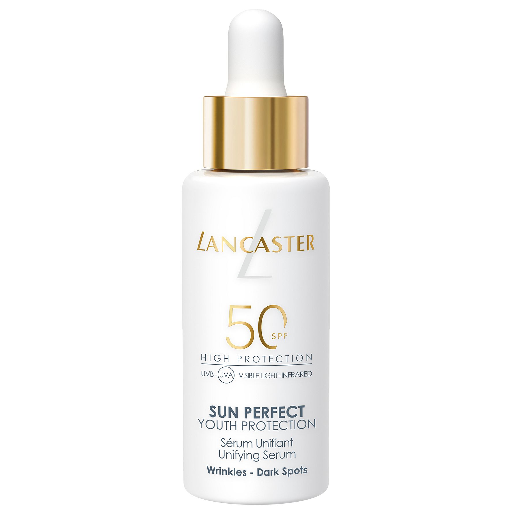 Sun Perfect Unifying Serum SPF50 on korkean teknologian ultrakevyt seerumi, joka tarjoaa Lancasterin edistyksellisimmän suojan valovanhenemista vastaan – samalla kun se parantaa ihon ulkonäköä päivä päivältä. Full Light Technology™ ja Sun Repair System suojaavat ihoa 100 %:sti auringon spektriltä* ja auttavat korjaamaan auringon aiheuttamia vaurioita. C-vitamiinia ja niasiiniamidia sisältävä kosteuttava seerumi häivyttää tehokkaasti pigmenttiläiskiä ja ryppyjä. Iho näyttää vähitellen tasaisemmalta, kirkkaammalta ja nuorekkaammalta.