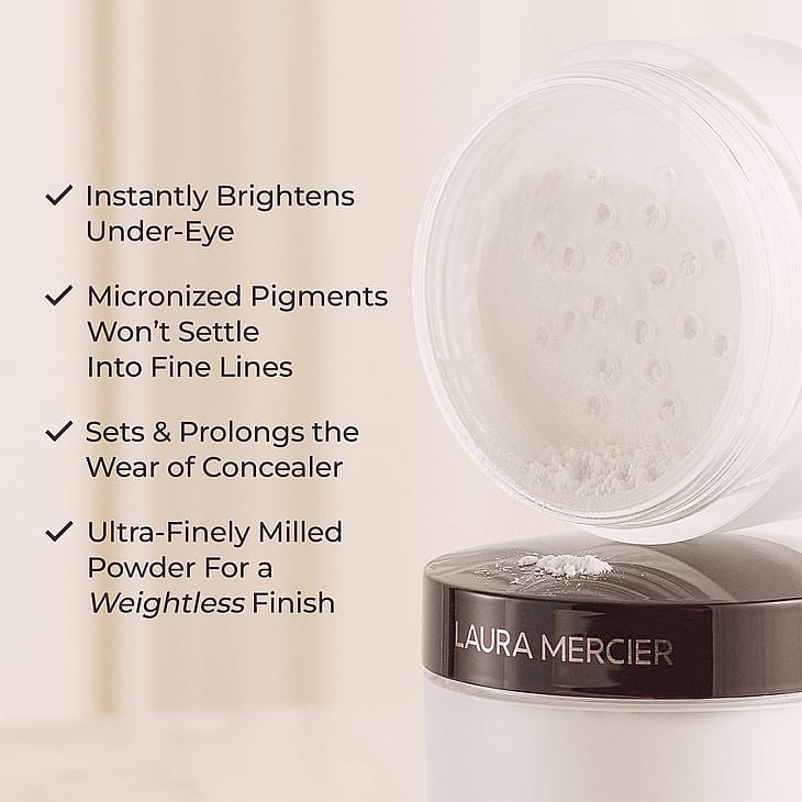 Suosittu Laura Mercier Secret Brightening Powder on ilmaakin kevyemmän tuntuinen puuteri, joka kiinnittää ja pidentää concealerin, correctorin ja muiden silmänalustuotteiden käyttöä. Tämä puuteri parantaa välittömästi silmänympärysalueen ulkonäköä, ja antaa virkistävän ja kirkastavan vaikutuksen.