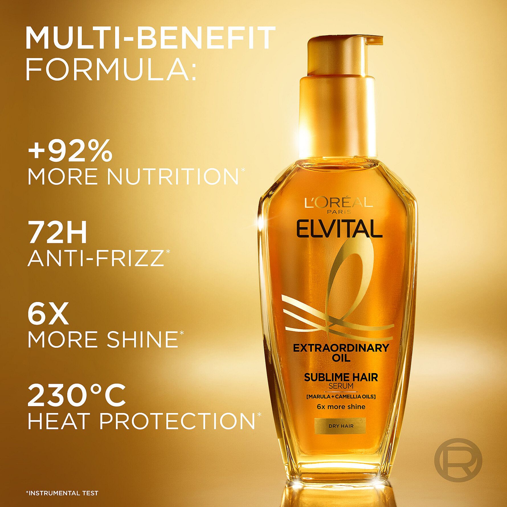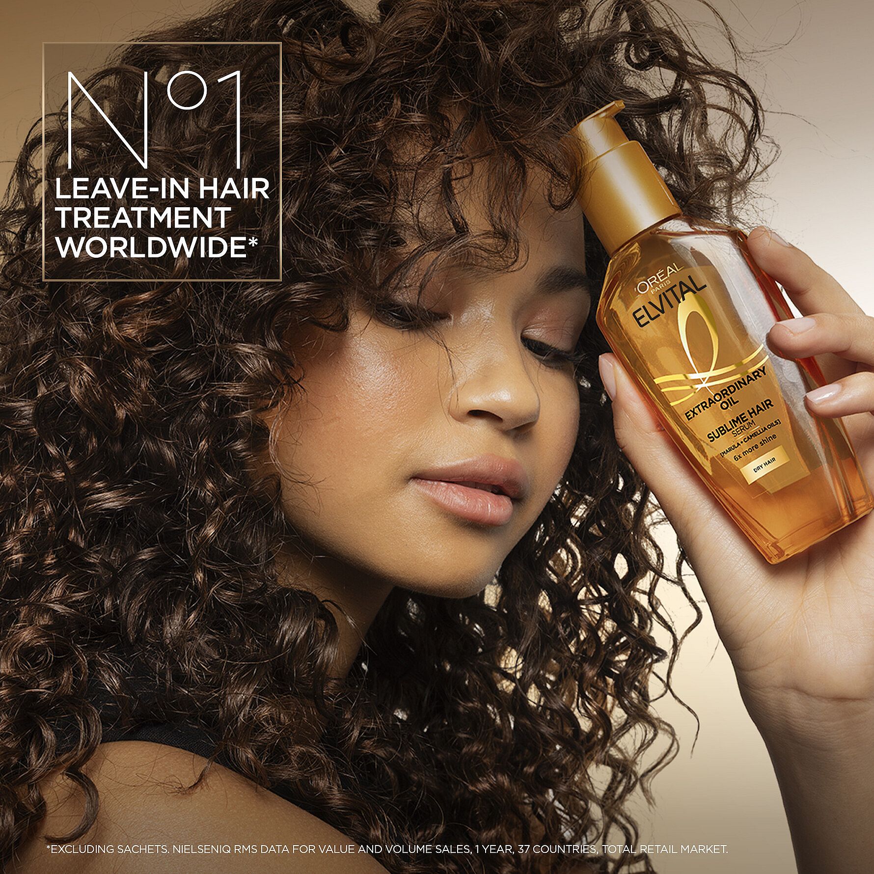 L'Oréal Paris Elvital Extraordinary Oil -hiustenhoitoöljy kaikille hiustyypeille sopii käytettäväksi monin eri tavoin. Anna öljyn aistillisen tuoksun vietellä sinut. Se on enemmän kuin hoitava öljy, se on päivittäinen kauneusöljy! L'Oréal Paris Elvital Extraordinary Oil sisältää ainutlaatuisen yhdistelmän 6 kukkaisöljyä ja tekee hiuksista silkinpehmeät ja kiiltävät ilman, että ne latistuvat. Voit käyttää öljyä kuiviin hiuksiin hoitamaan, auttamaan muotoilussa, tai antamaan kampaukselle viimeisteltyä kiiltoa! Koe uskomaton muutos kuiville hiuksille. Elvital Extraordinary Oil -sarjan tähtituote Extraordinary Oil -hiusseerumi on saatavana sekä normaaleille, kuiville että värjätyille hiuksille. Hemmotteleva koostumus kesyttää hiusten pörröisyyttä ja sähköisyyttä. Tuote-edut: