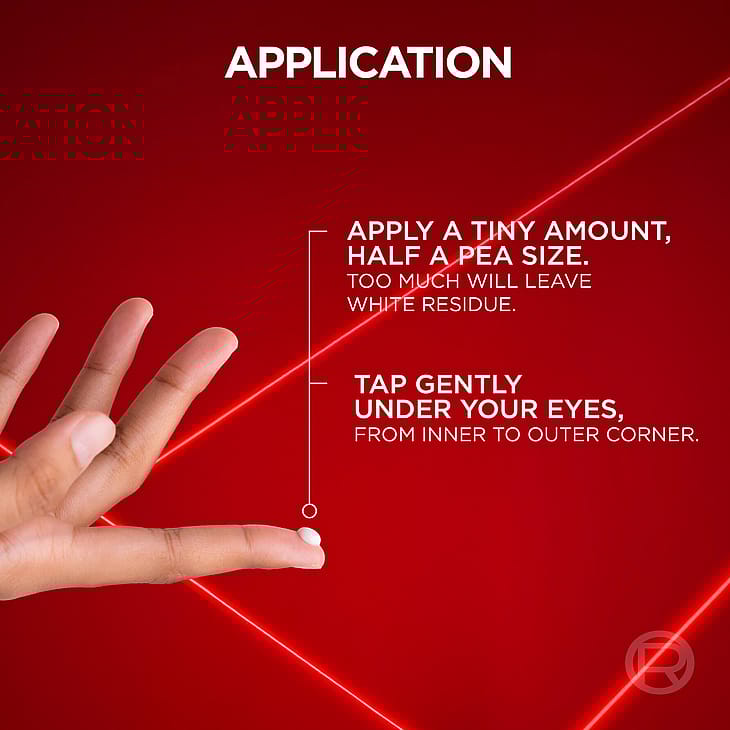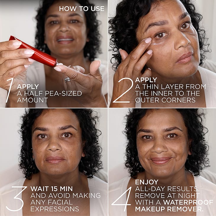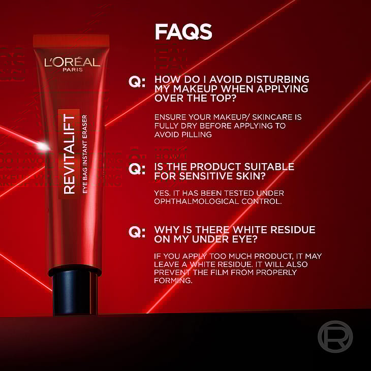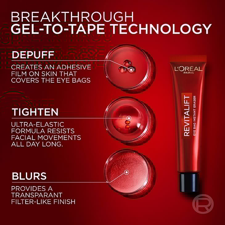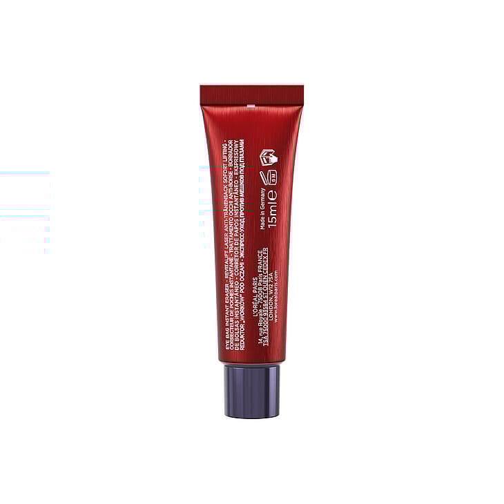 L'Oréal Paris Revitalift Laser Eye Bag Instant Eraser on geelimäinen silmänalusihoa hoitava tuote, joka vähentää merkittävästi silmäpussien näkyvyyttä ja antaa nuorekkaamman ilmeen. Vain 15 minuutissa Instant Eraser kiinteyttää ja tasoittaa näkyvästi silmäpusseja, vähentää turvotusta ja kiintyettää veltostunutta silmanalusihoa. Innovatiivinen geelimäinen teknologia muuttaa koostumuksen näkymättömäksi kalvoksi levitettäessä, joka kiinteyttää ja häivyttää silmäpusseja ja tuntuu samalla miellyttävältä iholla. Joustava koostumus myötäilee kasvojen liikkeitä ja pysyy paikoillaan koko päivän antaen pitkäkestoisia tuloksia. Kosmeettis-kliiniset tulokset: Vähentää ryppyjen sekä silmäpussien ja turvotuksen näkyvyyttä 8 tunnin ajan. Tulokset 15 minuutin kuluttua: 95 % tuotetta kokeileista koki, että silmäpussit ovat näkyvästi vähentyneet* ja 94 % koki, että silmänalusiho on kiinteämpi, sileämpi ja kohotettu*. Käytä ihonhoitorutiinisi viimeisenä vaiheena ihonhoitorutiinissasi, myös meikin päällä. Väliaikainen vaikutus, tuote tulee poistaa illalla.