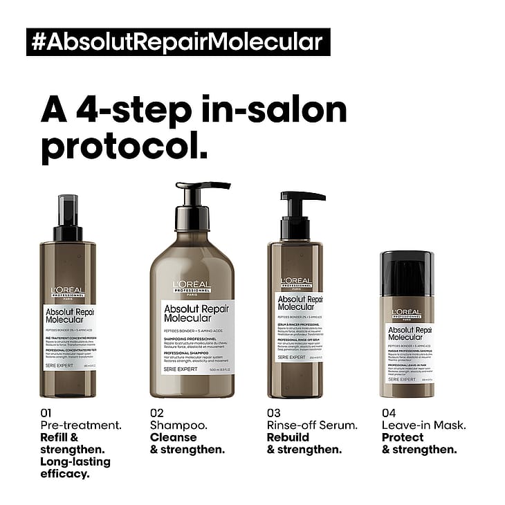 [KYSY ABSOLUT REPAIR MOLECULAR -KAMPAAMOPALVELUA] Pyydä seuraavalla kampaamokäynnilläsi kampaajaltasi Absolut Repair Molecular -hoitorutiinia, joka korjaa hiusten molekyylirakennetta** ja 2 vuoden aikaisia vaurioita yhdellä käyttökerralla*. Tarjoaa vahvemmat hiukset palauttaen niiden elastisuuden ja liikkuvuuden.