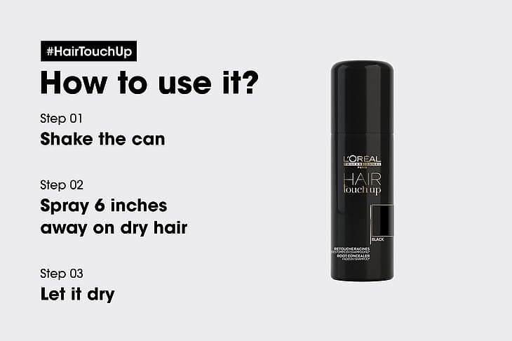 L'Oréal Professional Hair Touch Up Black on suihke peittämään väliaikaisesti tyvikasvun ja harmaat hiukset.