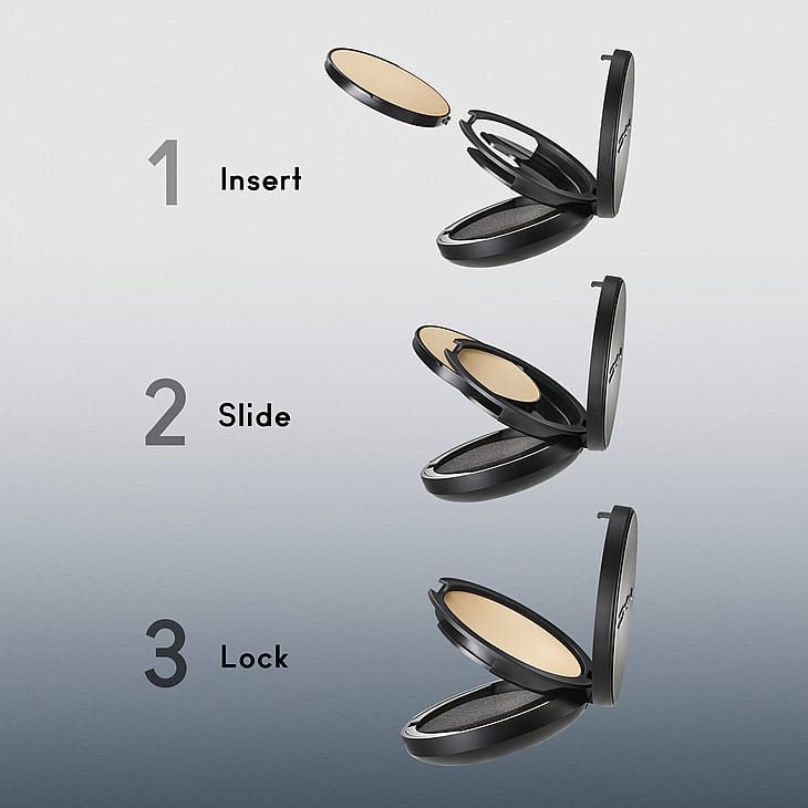 Peittävyyden lisäämiseksi levitä mukana tulevalla sieniapplikaattorilla tai 170S Brush -siveltimellä. Säilytä sieni puuterin alla olevassa lokerossa eikä suoraan puuterin päällä.