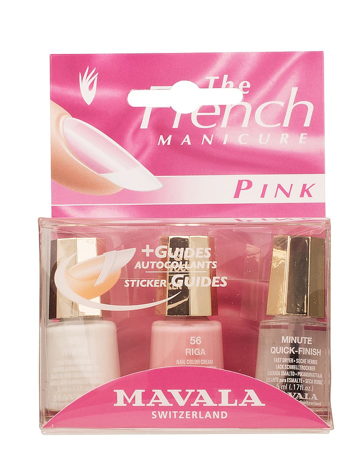 Mavalan ranskalaiseen manikyyriin tarkoitetulla pakkauksella teet helposti tyylipuhtaan ranskalaisen manikyyrin. Pakkaus sisältää White- ja Riga-kynsilakat sekä Minute Quick Finish päällyslakan, joka saa lakan kuivumaan nopeasti ja lisää sen kiiltoa.