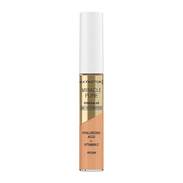 Usko ihmeeseen! Miracle Pure Concealer on ihonhoidon inspiroima ja Max Factorin kehittämä. -Tämä concearler on rikastettu hyaluronihapolla, C-vitamiinilla ja peptideillä, ja sen hoitava ominaisuus käytössä on kliinisesti todistettu. Kevyt koostumus on puolipeittävä, poimuton ja luonnollinen ja kestää koko päivän. Voidaan hienosti käyttää kasvoilla ja silmien alla terveellisen ja kirkastavan vaikutuksen saavuttamiseksi 24 tunnin kosteutuksella. -100 % vegaaninen. Kliinisesti ja dermatologisesti testattu. Sopii herkälle iholle. Suunniteltu käytettäväksi Max Factorin Miracle Pure -meikkivoiteen kanssa.