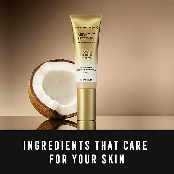 Max Factor Miracle Second Skin on hybrid-meikkivoide, joka hoitaa, tasoittaa ja on kevyesti peittävä. Miracle Second Skin kosteuttaa kookosmaidolla ja aloe veralla ja suojaa ihoa pre- ja probioottisesti ja siinä on SPF20.Miracle Second Skin kosteuttaa ihoa koko päivän samalla, kun iho saa luonnollisen hohdon. Se on ohut ja helppo levittää, tuntuu höyhenenkevyeltä iholla ja peittää kevyesti ja luonnollisesti. Iho saa kosteutta kookosmaidosta, hoitavasta aloe verasta ja pre- ja probioottisen suojan. Miracle Second Skin sisältävät lisäksi SPF 20:tä ja se on rikastettu B- ja C-vitamiinilla ja beetakaroteenilla, jotka antavat iholle elastisuutta, hohtoa ja hehkua. Tämä voimistava koostumus sopii kaikille ihotyypeille, myös aroille ihoille. Kliinisesti ja dermatologisesti testattu.• Kevyesti peittävä ja tasoittava • Rikastettu kosteuttavalla kookosmaidolla ja aloe veralla • Voimistaa pre- ja probioottisilla ja B- ja C-vitamiinilla• SPF 20• Kliinisesti testattu• Dermatologiskt testad