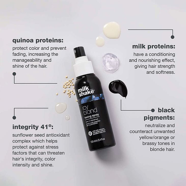 Koostettu erityisellä mustalla pigmentillä, joka neutraloi keltaisia ja kellanoransseja sävyjä vaaleissa tai vaalennetuissa hiuksissa antaen niille tuhkan sävyn. Vahvistaa ja kosteuttaa hiuksia, tehden niistä terveet ja kiiltävät sekä helpommin kammattavat. Käyttö: ravista hyvin ja suihkuta pestyihin, pyyhekuiviin hiuksiin 10–15 cm etäisyydeltä, kampaa ja kuivaa. Päivittäisenä viimeistelynä suihkuta kuiviin hiuksiin noin 30 cm etäisyydeltä.