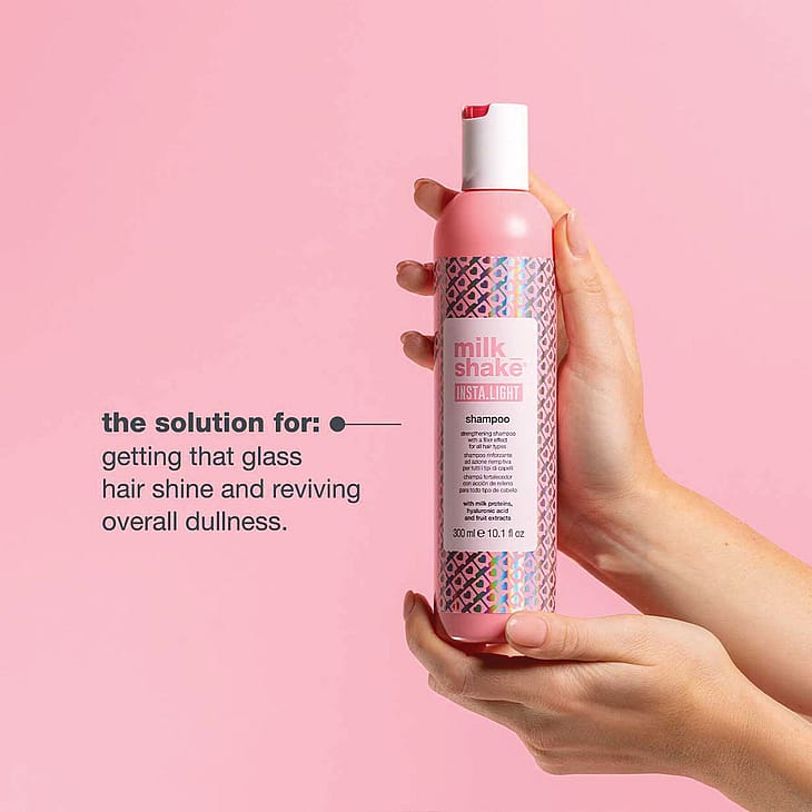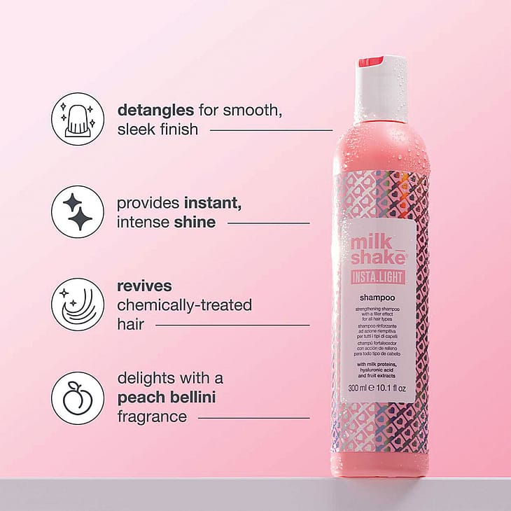 Hellävaraisesti puhdistava shampoo, joka tekee hiuksista helposti hallittavat, pehmeät ja kiiltävät. Sisältää maitoproteiineja, hyaluronihappoa sekä sitruuna- ja mustikkauutteita, joilla on täyttävä ja elvyttävä vaikutus. Käyttö: levitä kosteisiin hiuksiin, vaahdota ja huuhtele. Toista ja huuhtele huolellisesti. Käytä sen jälkeen milk_shake® insta.lotion -hoitotuotetta.