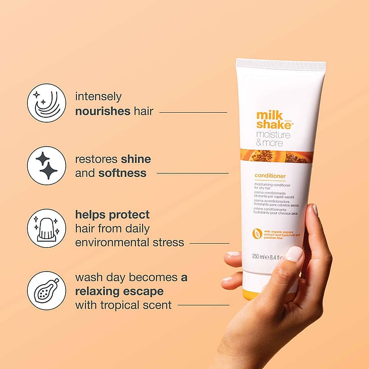 Sen kevyt koostumus, johon on lisätty trooppisten hedelmien raikas tuoksu, hoitaa hiuksia syvältä jättäen ne kosteutetuiksi ja helposti käsiteltäviksi. Sisältää hyaluronihappoa, joka ylläpitää optimaalisen kosteustasapainon ja vahvistaa hiuksia jättäen ne kiiltäviksi ja vahvoiksi, sekä luomupapaya-uutteita hiusten hoitoon. Sisältää niasiiniamidia, jolla on antioksidanttinen ja siloittava vaikutus hiuksiin. Käyttö: Levitä tasaisesti puhtaille, kosteille hiuksille, anna vaikuttaa muutaman minuutin ajan ja huuhtele. Jatka hoitoa milk_shake® moisture&more whipped cream -tuotteella lisäkosteutusta varten.