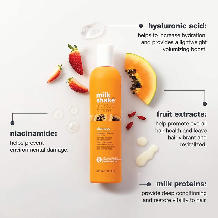 Tämä hellävarainen, hoitava shampoo puhdistaa hiukset ja kietoo ne pehmeään, hedelmäntuoksuiseen vaahtoon. Hyaluronihappo ylläpitää optimaalisen kosteustasapainon ja vahvistaa hiuksia jättäen ne vahvoiksi ja kiiltäviksi. Integrity 41® takaa täydellisen värisuojan. Koostumus sisältää niasiiniamidia, jolla on antioksidanttinen ja silottava vaikutus hiuksiin. Käyttö: levitä tasaisesti kosteisiin hiuksiin, hiero ja huuhtele. Toista tarvittaessa. Käytä sen jälkeen milk_shake® moisture&more -hoitoainetta.
