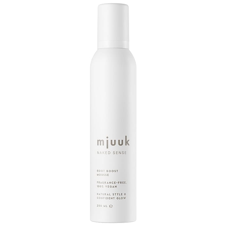 MJUUK Naked Sense Fragrance-Free Root Boost Mousse antaa tuuheutta ja rakennetta ilman, että hiukset tuntuvat raskailta. Hiuksista tulee raikkaat, kimmoisat ja elinvoimaiset tyvestä latvaan. Koostumus on 100 % vegaaninen, hajusteeton ja silikoniton. Pakkaus on kierrätettävä.