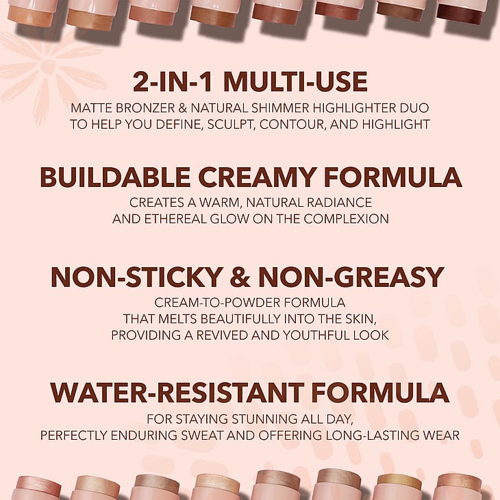 Sculpt & Glow Duo Stick on silkinsileä ja helposti häivytettävä, joten voit luoda virheettömän ilmeen vaivattomasti. Tahraamaton ja pitkäkestoinen koostumus muuttuu iholle levittäessä puuterimaiseksi.